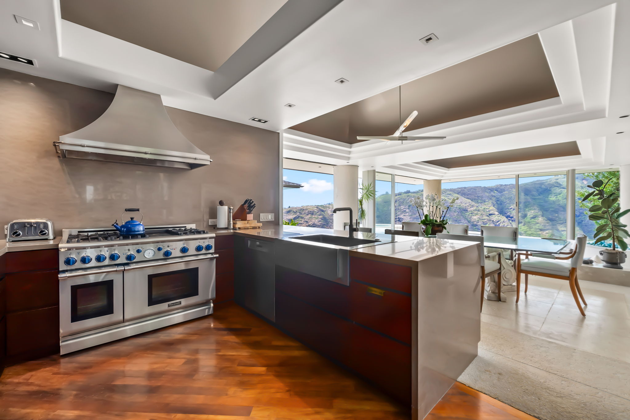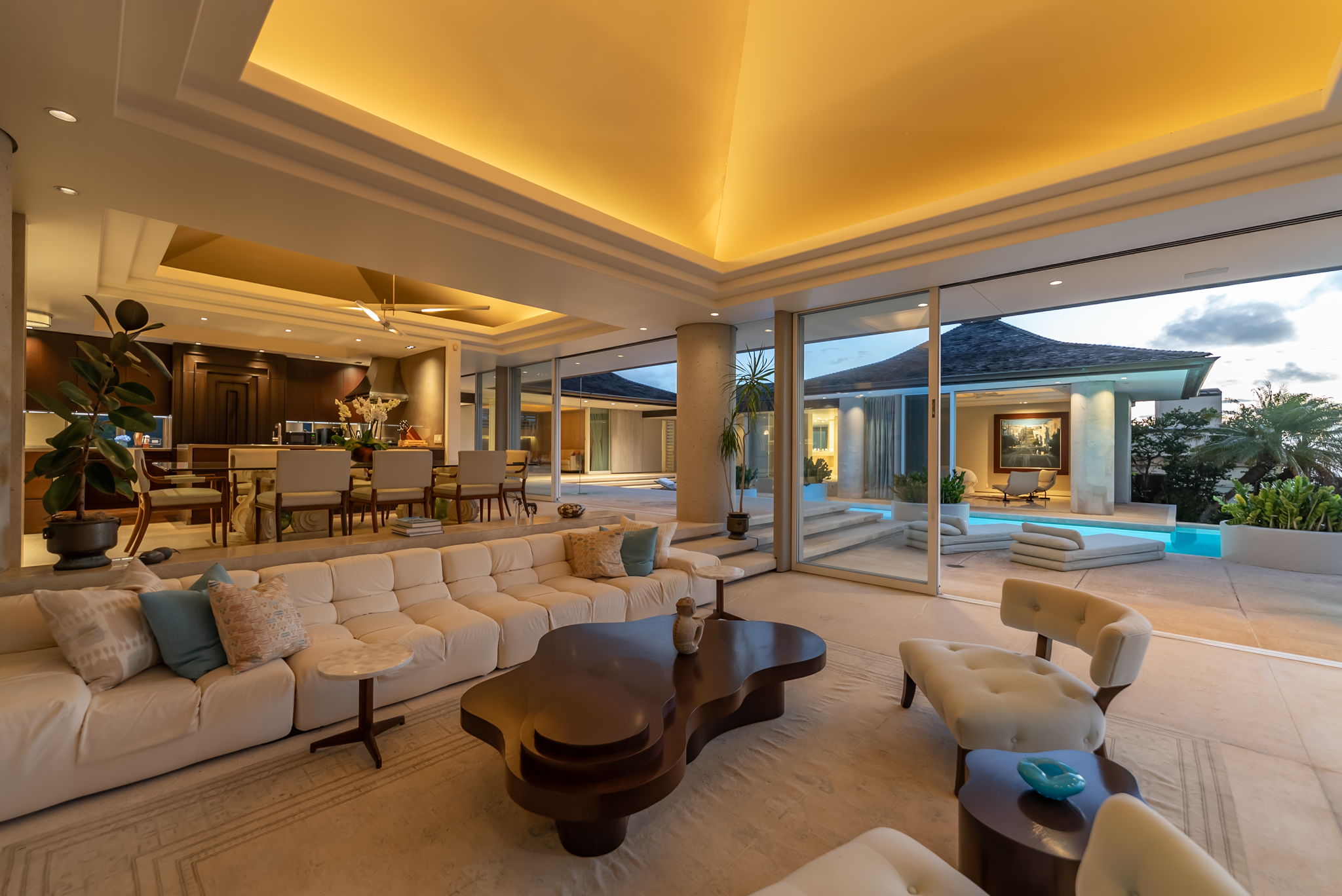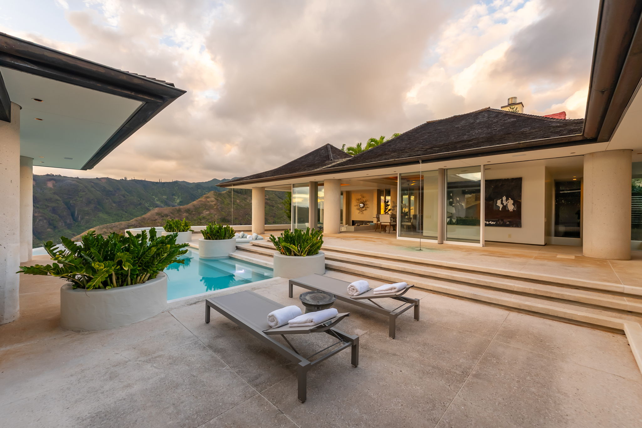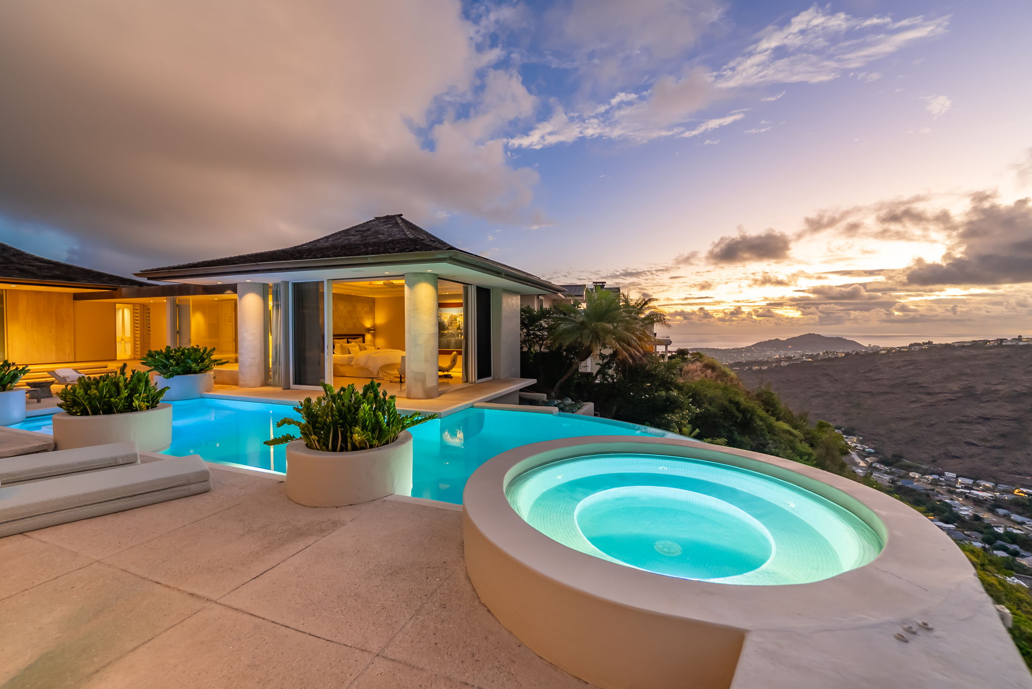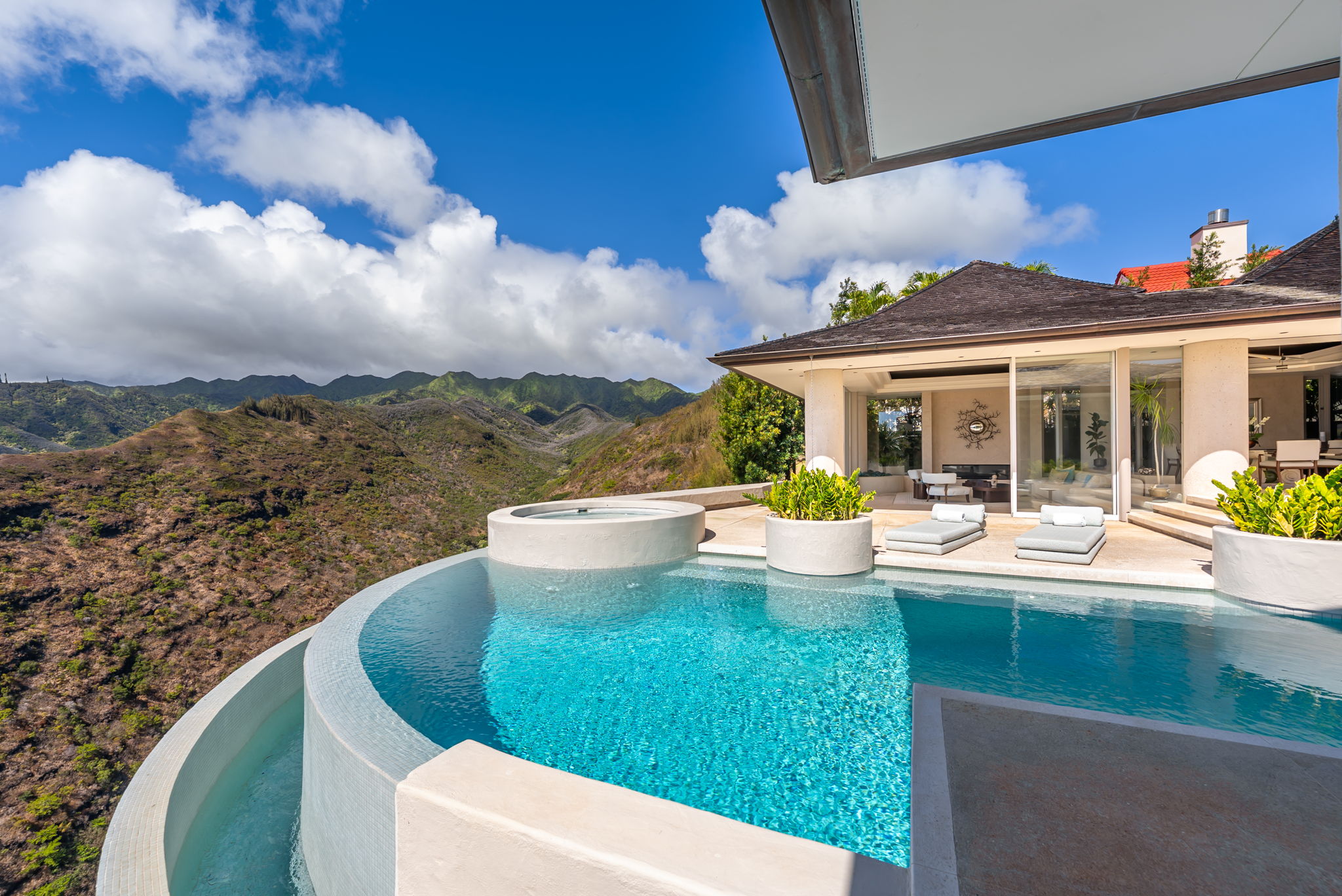 Positioned on a rim lot, the property captures some of the most breathtaking sunsets on Oahu. Enjoy an infinity-edge pool and spa overlooking the ocean. The chef’s kitchen is equipped with high-end appliances designed for both everyday living and entertaining. Located within the secure gates of Hawaii Loa Ridge, this residence offers privacy, serenity, and easy access to Honolulu’s best shopping, dining, and beaches. The Summit Retreat House is more than a home—it’s a refined retreat above it all, where modern design meets Hawaii’s natural beauty.