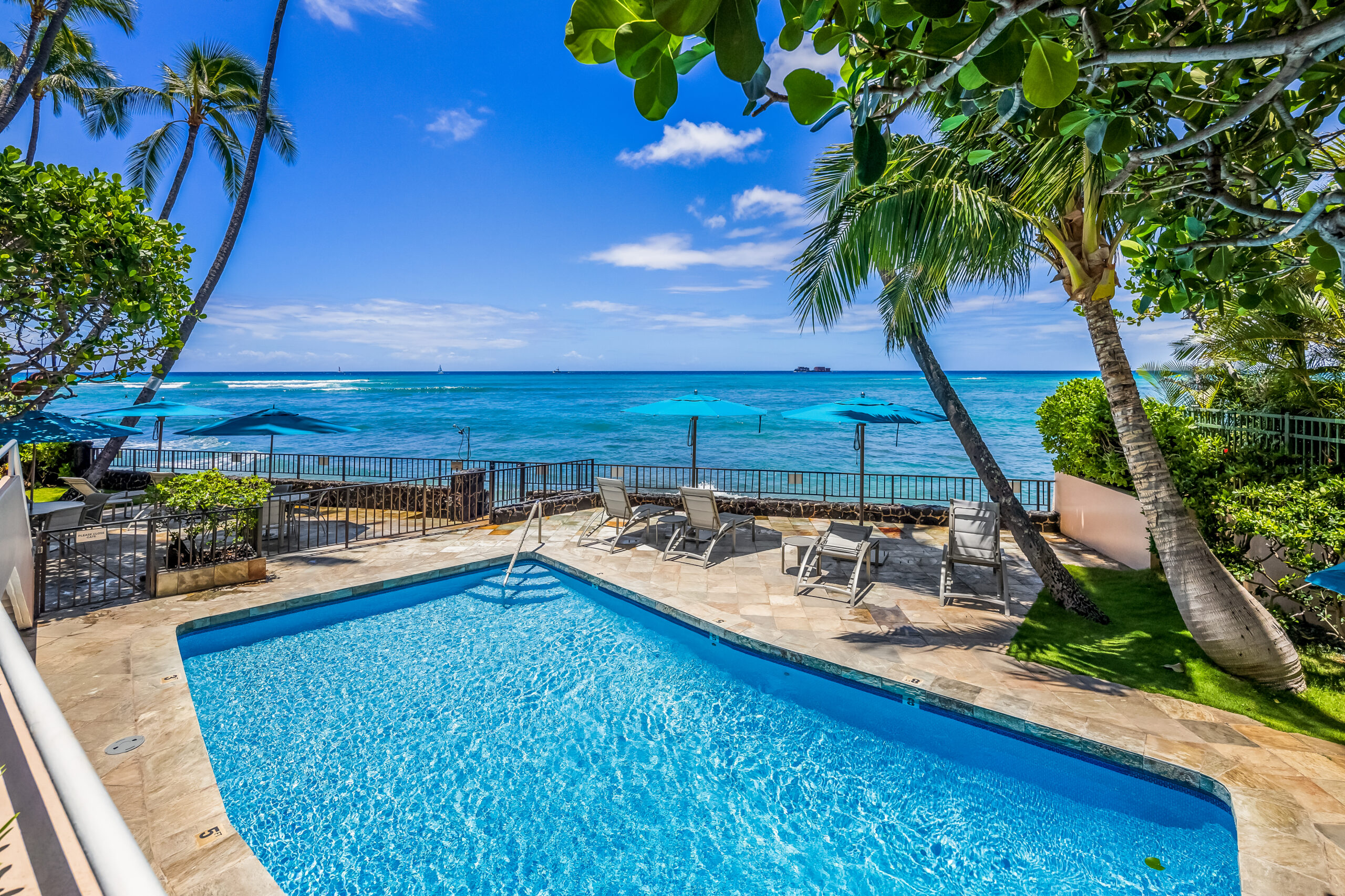 This stunning fully furnished two-bedroom, two-bath oceanfront condominium offers a perfect blend of luxury and tranquility. With a very large, open, and spacious floor plan, the living areas flow seamlessly, providing ample room for relaxation and entertaining. This oceanfront condo also has breathtaking views of both Kapiolani Park and Diamond Head surround you, complemented by lush greenery right outside your windows.