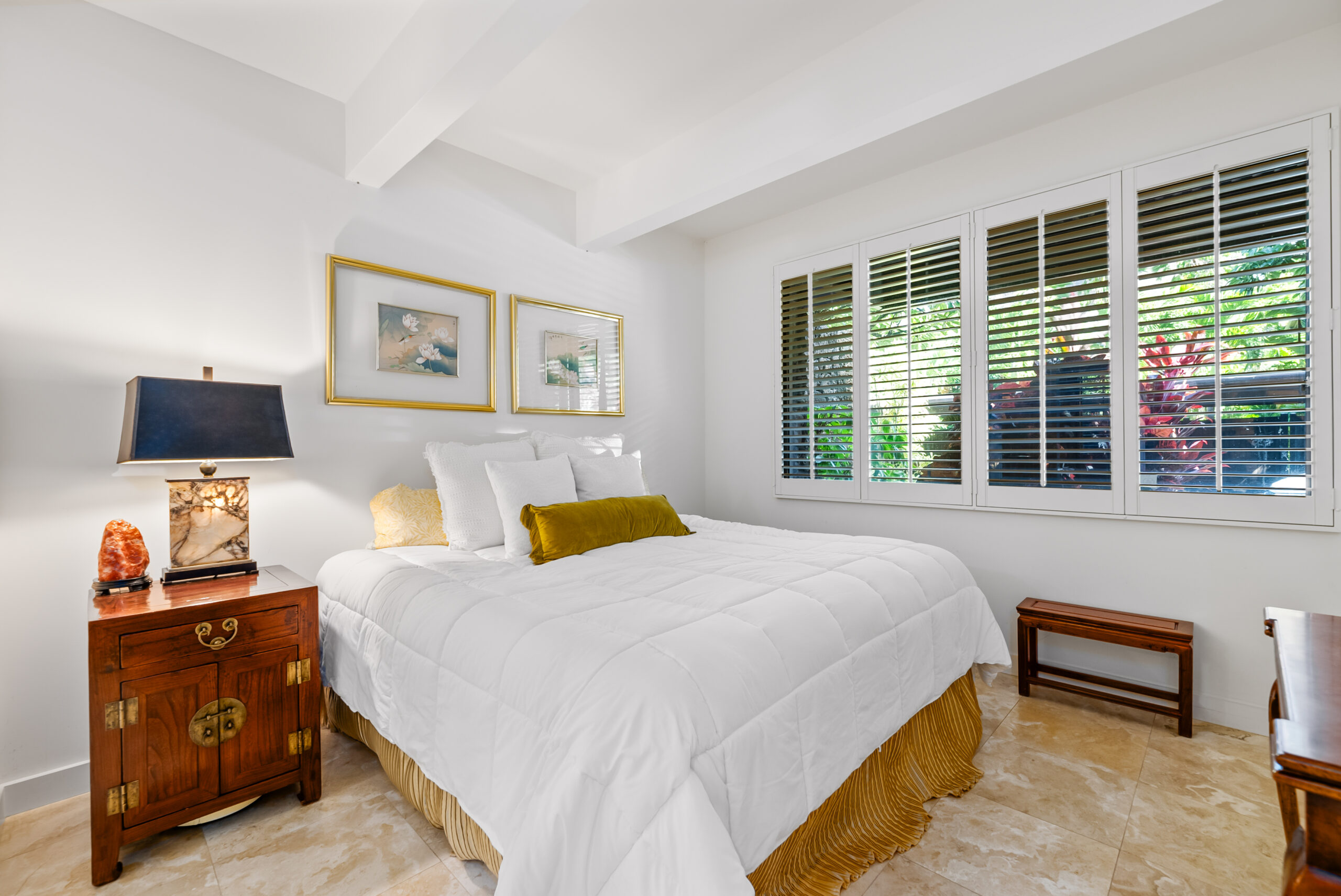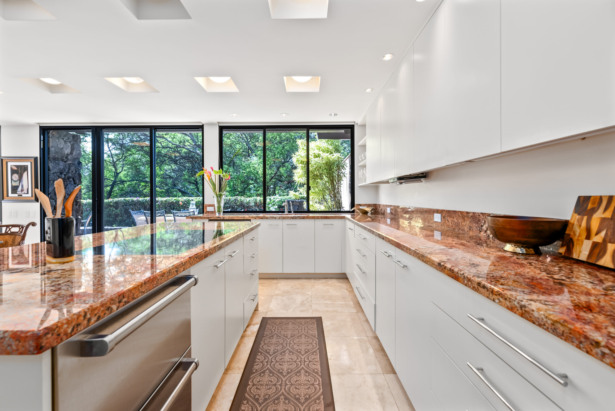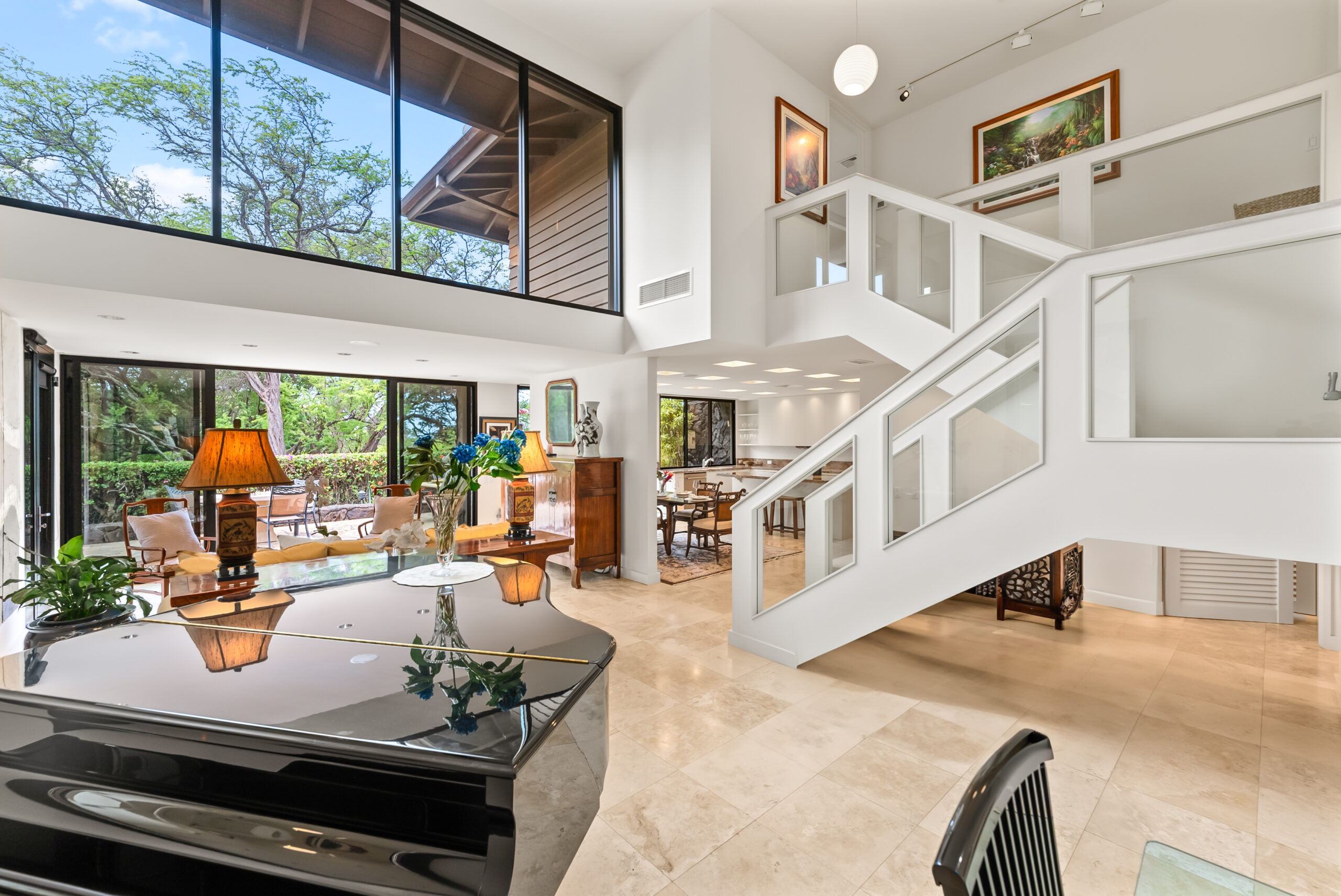 Highlights include soaring cathedral ceilings, travertine flooring, designer lighting, and a dedicated home office that provides the perfect retreat for remote work or creative pursuits. The gourmet kitchen, equipped with a large granite island and Sub-Zero refrigerator, flows seamlessly to the spacious lanai, a BBQ area, and lush garden views. Additional features include electric window shades, white shutters, an advanced entertainment system, and secure two-car covered parking.