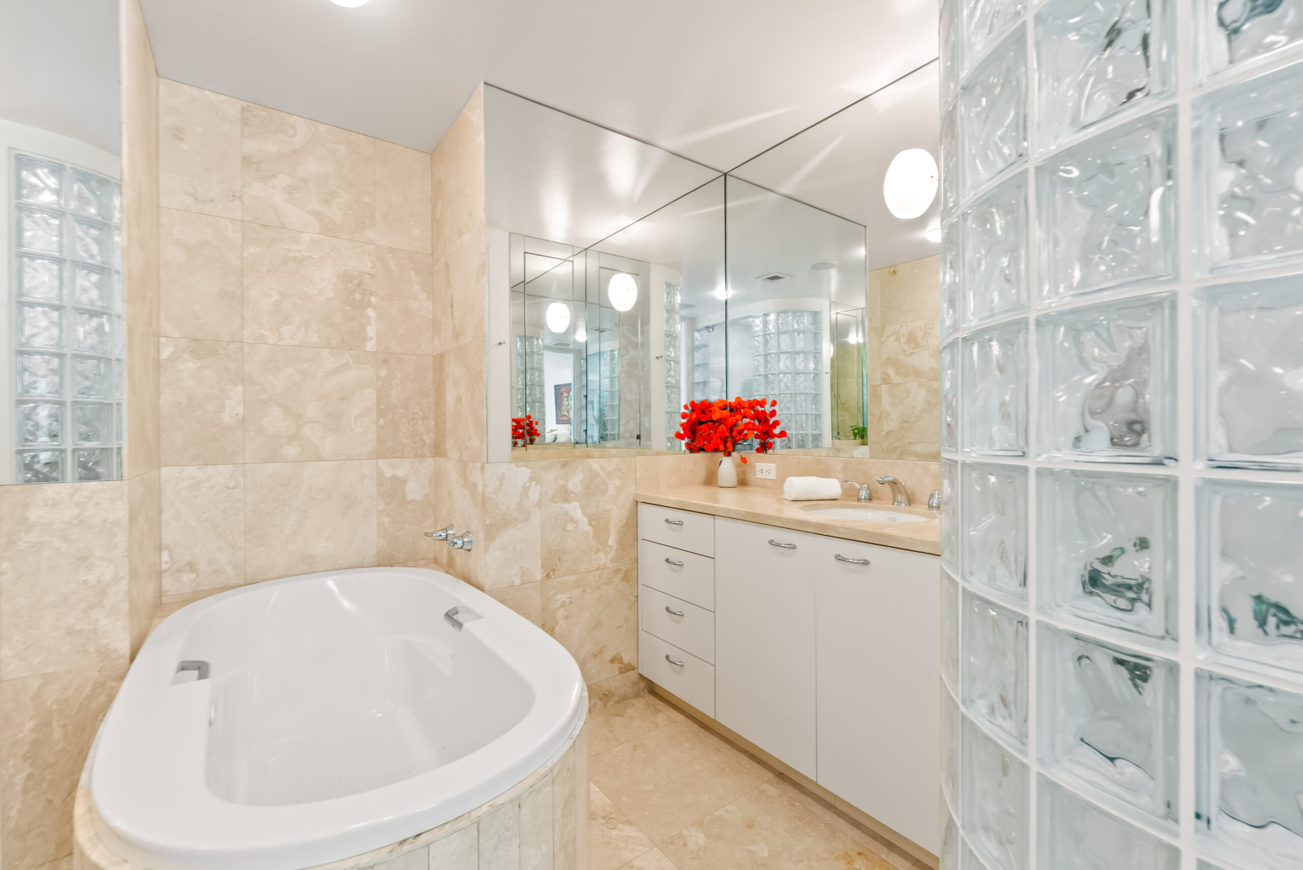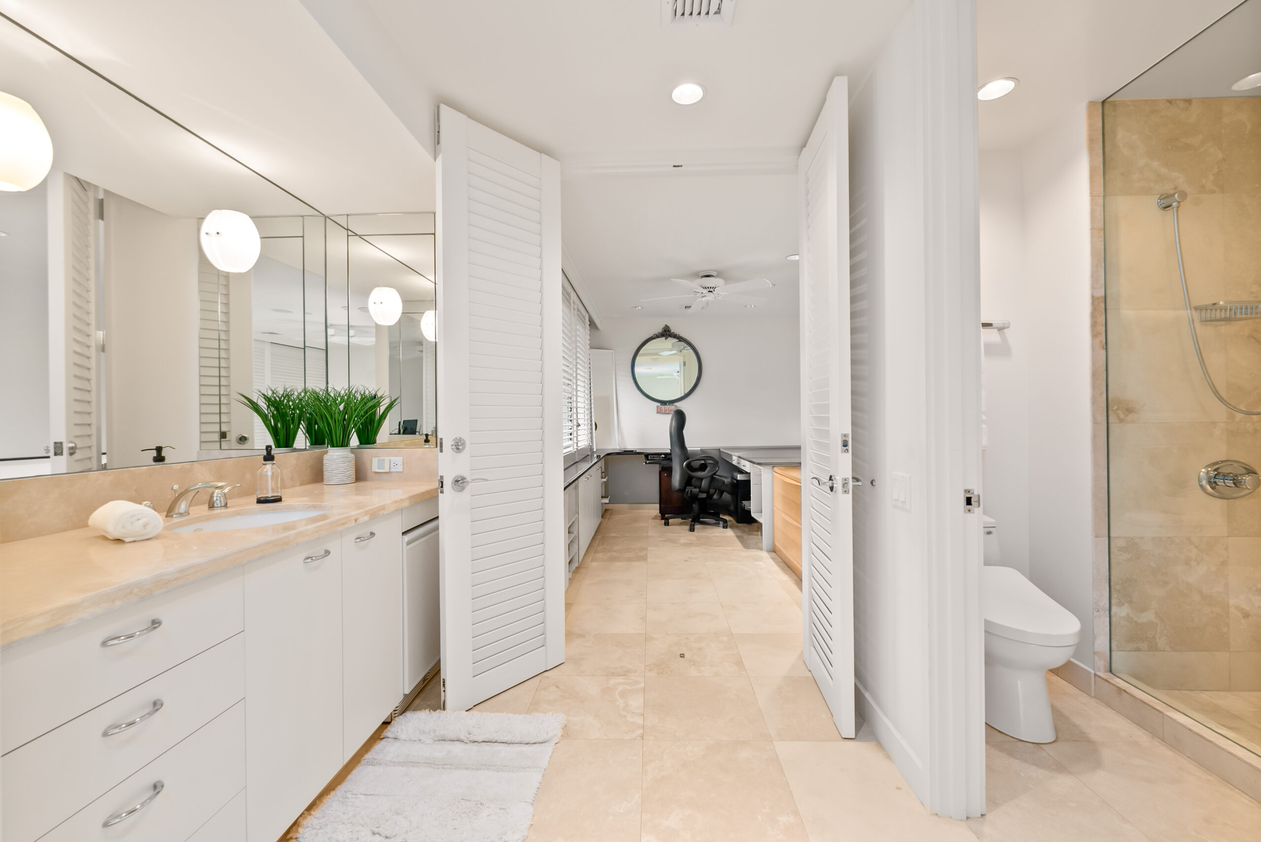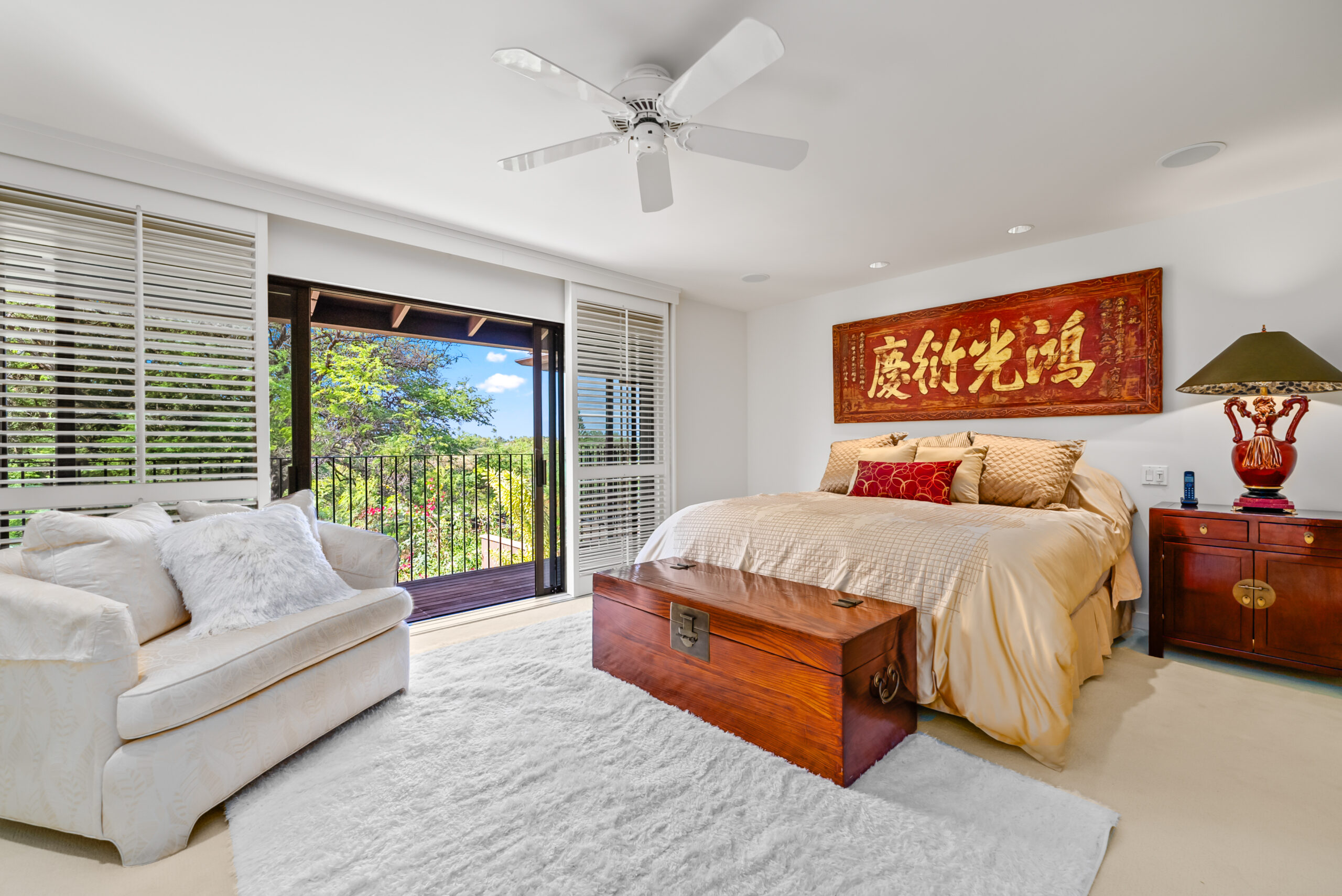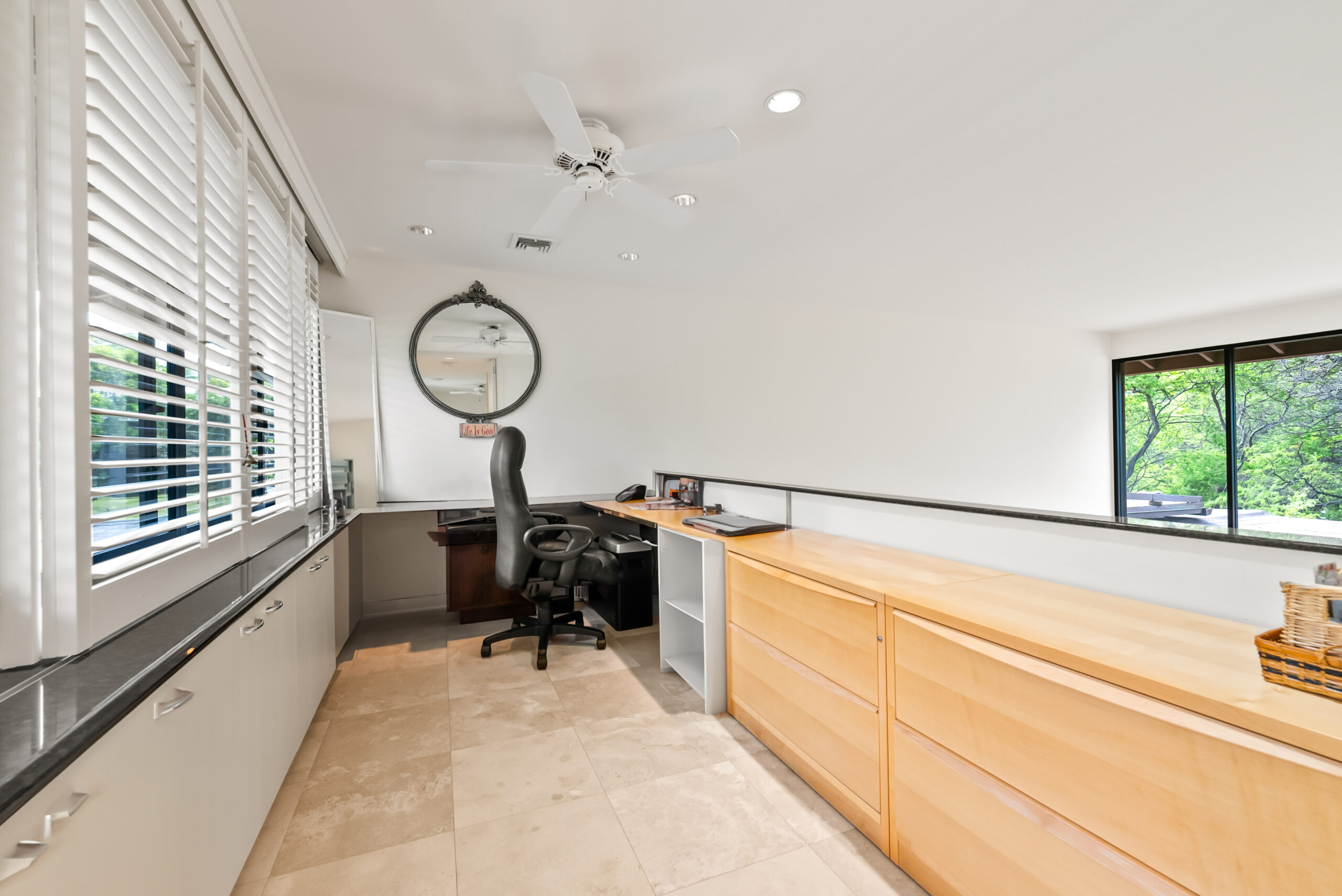 Highlights include soaring cathedral ceilings, travertine flooring, designer lighting, and a dedicated home office that provides the perfect retreat for remote work or creative pursuits. The gourmet kitchen, equipped with a large granite island and Sub-Zero refrigerator, flows seamlessly to the spacious lanai, a BBQ area, and lush garden views. Additional features include electric window shades, white shutters, an advanced entertainment system, and secure two-car covered parking.